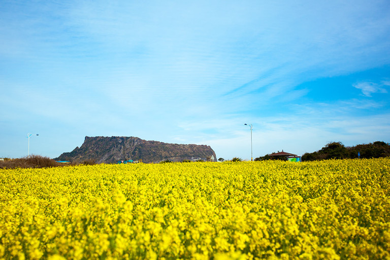 🌟 특징: 유채꽃과 함께 성산일출봉을 배경으로 한 장관이 펼쳐짐